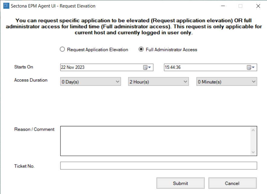 The assigned user policy denies your access. In case of access denial, you will have to request access by right-clicking on the agent icon from the System Tray located in the taskbar and select New Request. Then you will see this window pop up:-