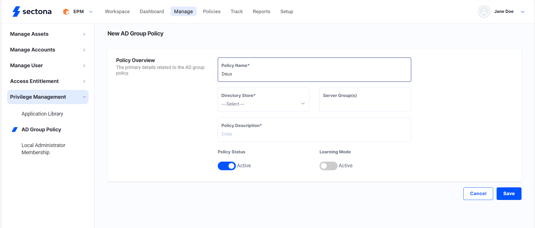 Click on Manage → Click on Privilege Management from the sidebar → select AD Group Policy.