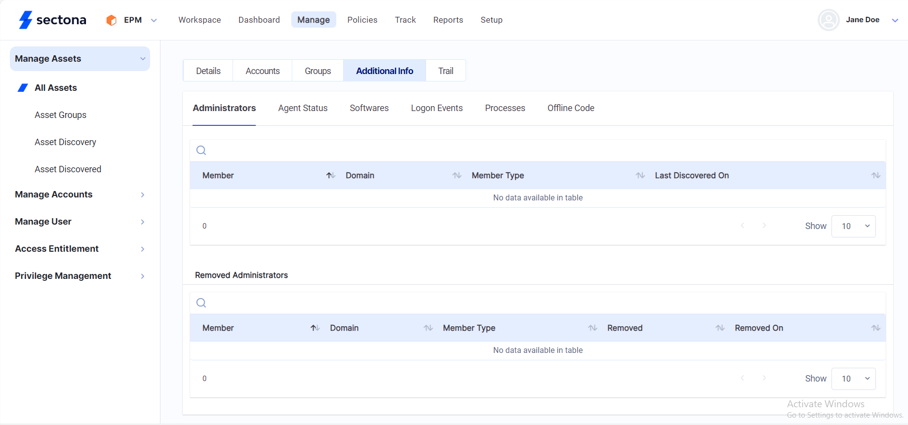 Here you will be able to view the details regarding Administrators, Agent Status, Software, Logon Events, Processors and Offline Code.