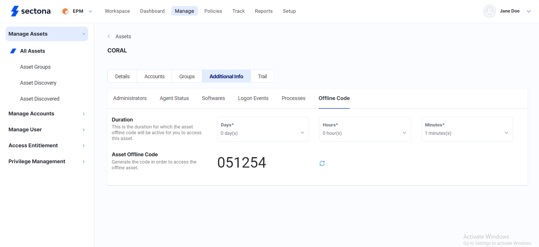 In scenarios where the EPM server is unreachable due to network unavailability, Sectona provides an Offline Code feature for the on-time access. The Offline Code is generated on the EPM server and when needed can be acquired from the EPM Administrator.