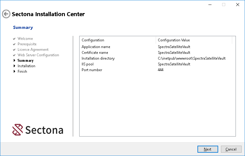 On the Web Server Configuration page, select the path to install the Satellite vault component (we recommend installing it on a secondary drive). Set the Site Name as 'SpectraSatelliteVault' and Port number (default:443). In the Certificate field, you can either Select a certificate from the available drop-down list, create a new certificate by selecting 'Create New' or you can choose a file from your local machine with the Choose button. Click on Next to continue.