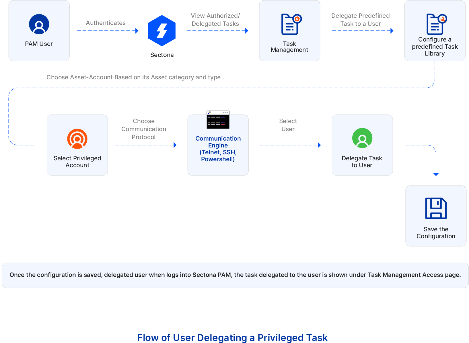 PAM User authenticates Sectona. Users can execute the privileged task without knowing the password of the privileged account. Go to Access - Task Management. Private/Delegated tasks will be shown here. Click on +New to configure a task. According to the base access type (SSH, Telnet, or PowerShell) of the task, select the privileged account. Now select the user you wish to delegate this task to and save the configuration. Once the configuration is saved, the delegated user when logs into Sectona PAM, the task delegated to the user is shown under the Task Management Access page: