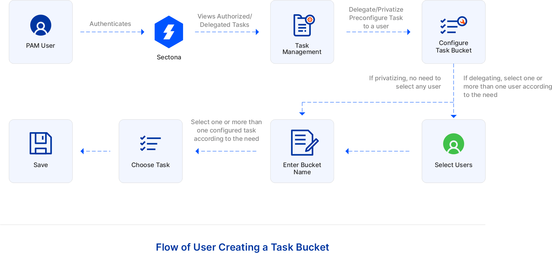 PAM User authenticates Sectona. User can create a task bucket where he/she can add one or more than one task and privatize/ delegate task to one or more than user by following few steps. Go to Access – Task – Task Bucket. Configure task bucket by clicking on +New. If delegating, select one or more than one user according to the need. You need not select any user if privatizing. Once users are select, enter the task bucket name. Now choose a preconfigured task by selecting one or more than one configured task according to the need and save the configuration. Once the configuration is saved you can execute the task bucket by clicking on its run button. Users can also run one or more than one task bucket by selecting the task buckets and clicking on Execute Selected: