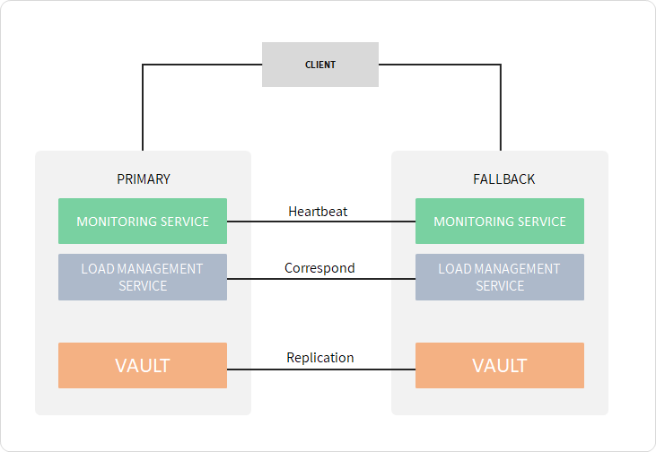 When using the embedded vault option without clustering, replication between nodes can be initiated to prevent data loss. In a high-availability setup, all configuration files are synchronized automatically from the primary node to the secondary node at an interval of one minute. Database synchronization happens instantly by physical replication of the database. The database on the secondary node is in read-replica mode.