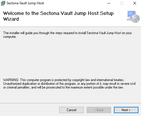 Download the Sectona Vault Jump Host Installer from the download portal. Launch the Sectona Vault Jump Host setup application. Once you run the application, you will be greeted with a Welcome page. Click on Next to continue.
