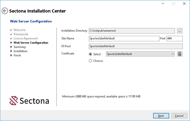 On the Web Server Configuration page, select the path to install the Satellite vault component (we recommend installing it on a secondary drive). Set the Site Name as 'SpectraSatelliteVault' and Port number (default:443). In the Certificate field, you can either Select a certificate from the available drop-down list, create a new certificate by selecting 'Create New' or you can choose a file from your local machine with the Choose button. Click on Next to continue.