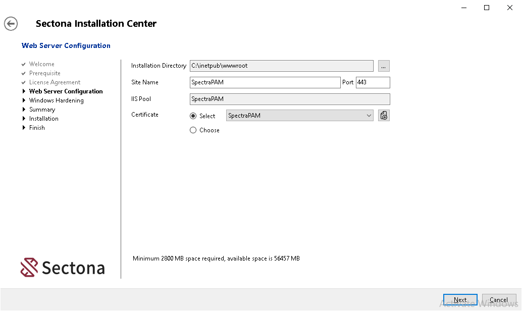 On the Web Server Configuration page, select the path to install the Sectona web access component (we recommend installing it on a non-OS drive. Provide the name of the site to be recognized by IIS Server and port number (default:443). It is mandatory to install the application with Secure Sockets Layer (SSL) certificate. You will need a certificate that you either request from a trusted root authority or create a self-signed one on your web server. Either select a certificate from the available drop-down list or create a new certificate by selecting 'Create New' or you can choose a file from your local machine using the Choose button. You can update or install a new certificate later on by Configuring HTTPs certificate. Click on Next to continue.