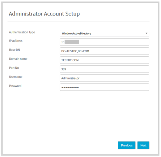 Default Administrator Credential: You can select from Sectona Authentication or Active Directory Authentication. Sectona authentication is a built-in authentication store that does not need to validate the user identity from an external source. AD Authentication: Active directory must be  configured and user details must be provided. Details provided will be added to your Sectona configuration.