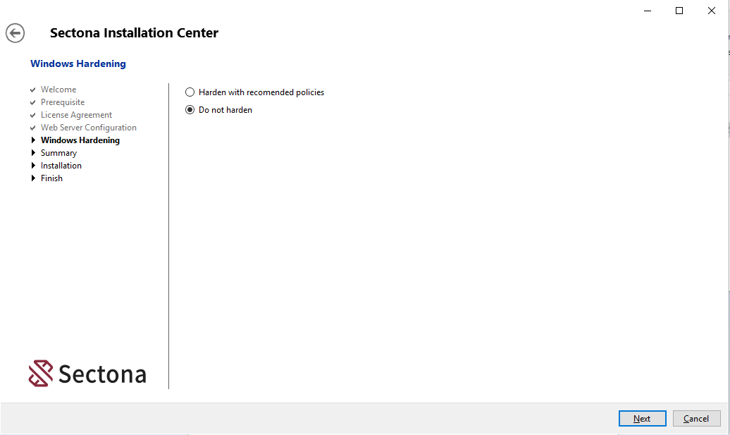 The system provides an automated method of hardening your application server based on minimum security guidelines. You can install the application without these steps. Consult your support team for hardening based on your settings. Click on Next to continue.