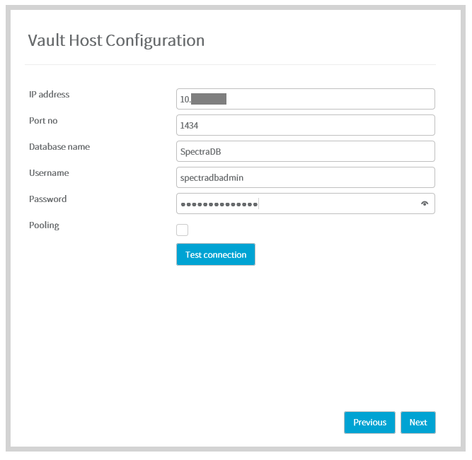 Vault host configuration: Sectona PAM supports Microsoft SQL as an external RDBMS engine. Refer to System Requirements to confirm supported Database engines. Ensure you have already installed the Microsoft SQL engine with a valid database name. Choose a valid authentication option at the database level i.e. Database Native Authentication. Enter the database name, the corresponding username, and the password to access the database. Fill in the username and password used to access the database.