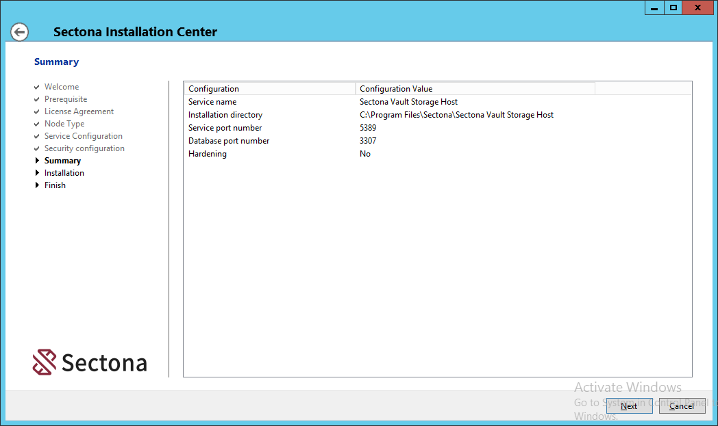 Installation of Embedded Sectona Vault Storage Host component