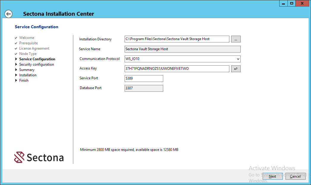 You will need to navigate to the vault configuration file and retrieve a unique Access Key and Communication Protocol Version ID of this installation. This is not your encryption key and user by web access can communicate with the vault for initiating the installation. Navigate to file located at %installation directory%\Sectona Vault Storage Host\SectonaVaultStorage\VaultStorage.cnfg.