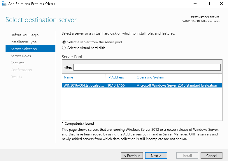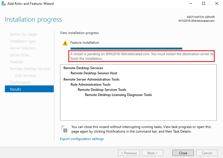 - You will be redirected to a confirmation window. Click on Install to install the roles and features. After successful installation, a Results window is displayed. Click on Close to exit. Next, you need to restart the server to finish the installation.