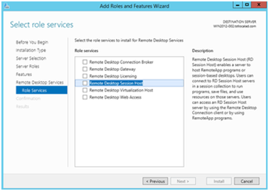 - After selecting the role, navigate directly to the Role Services window. Select the role service named Remote Desktop Session Host.