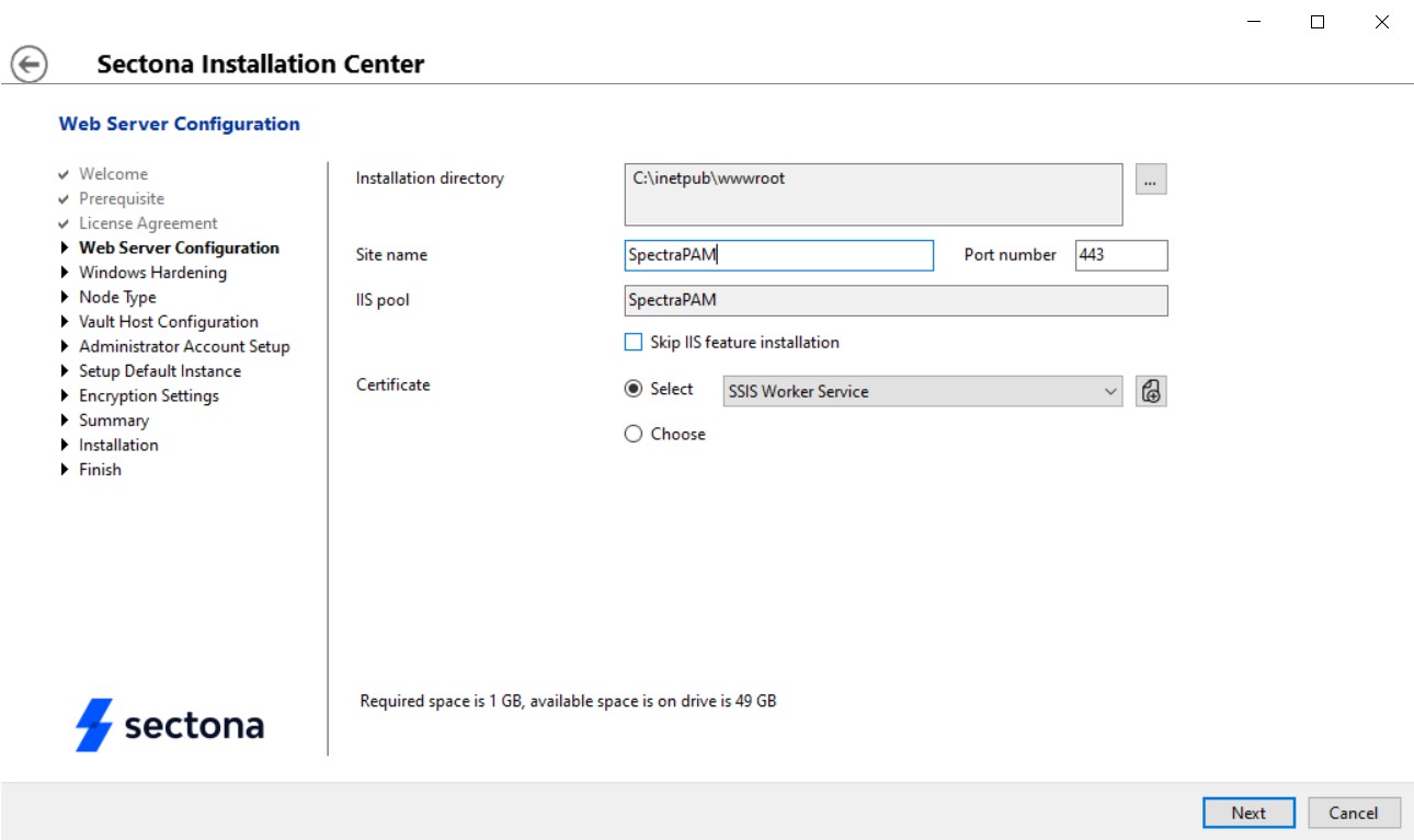 - On the Web Server Configuration page, select the path to install the Sectona web access component (we recommend installing it on a non-OS drive. Provide the name of the site to be recognized by IIS Server and port number (default:443). It is mandatory to install the application with Secure Sockets Layer (SSL) certificate. You will need a certificate that you either request from a trusted root authority or create a self-signed one on your web server. Either select a certificate from the available drop-down list or create a new certificate by selecting 'Create New' or you can choose a file from your local machine using the Choose button. You can update or install a new certificate later on by Configuring HTTPs certificate. Click on Next to continue.Click on Next to continue. In case want to add an additional certificate, click on Add self-signed certificate button followed by selecting the Choose radio button.