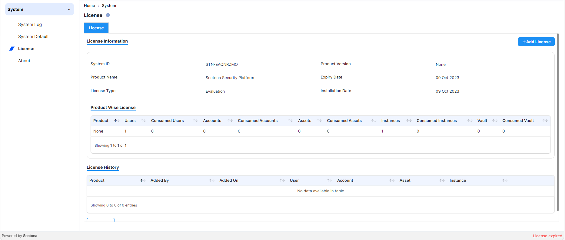 - A form will appear, here you will have to paste the License Key. You will have to contact the support team at support@sectona.com for further instructions.