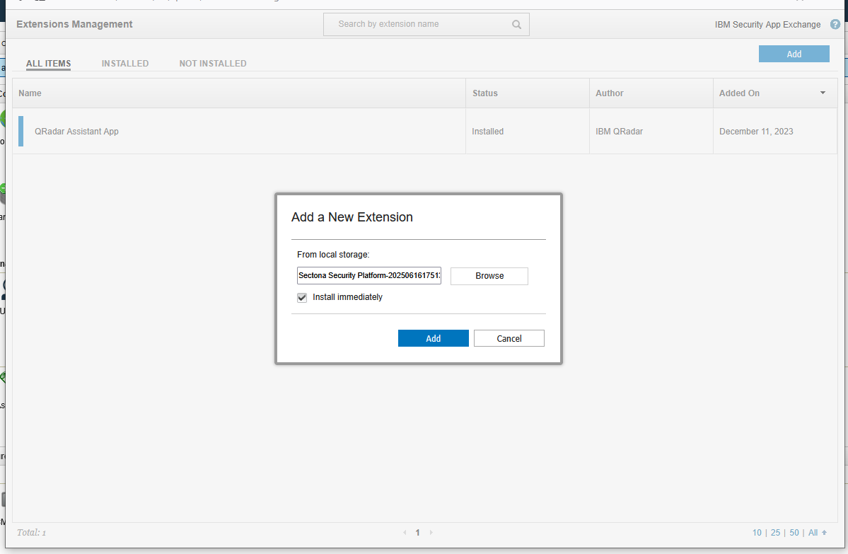 Click on browse to select the Sectona Security Platform extension file and click on Add.