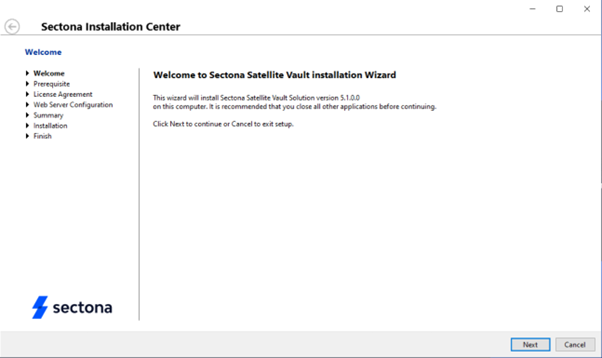 Run the installer. Launch the Satellite Vault installer using Windows Administrator Privileges. Click on Next to continue.